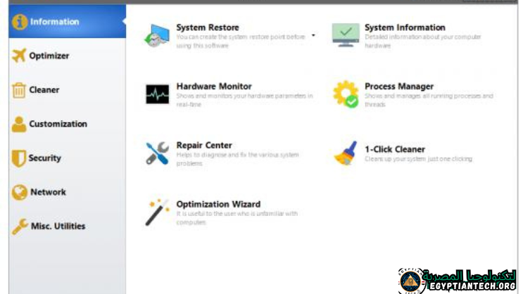 ; الحصول على معلومات مفصلة حول نظامك وأجهزتك، مما يساعدك على معرفة مفتاح منتج Microsoft مثل Microsoft Windows وMicrosoft Office؛ عرض وإدارة جميع العمليات والخيوط الجارية؛ يساعد مركز الإصلاح في تشخيص وإصلاح مشاكل النظام المختلفة؛ تنظيف النظام بنقرة واحدة فقط؛ معالج التحسين مفيد للمستخدم غير المعتاد على أجهزة الكمبيوتر.